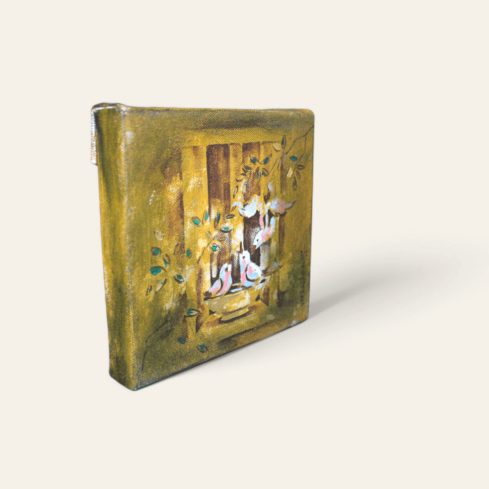 Gathering of Sparrows is an acrylic on canvas artwork that captures a peaceful moment as a small flock of sparrows perches around a water bowl, surrounded by warm, earthy tones. The delicate brushstrokes and soft hues bring depth and tranquility, reflecting the simple yet profound beauty of nature. The composition highlights the birds’ quiet interactions, […]