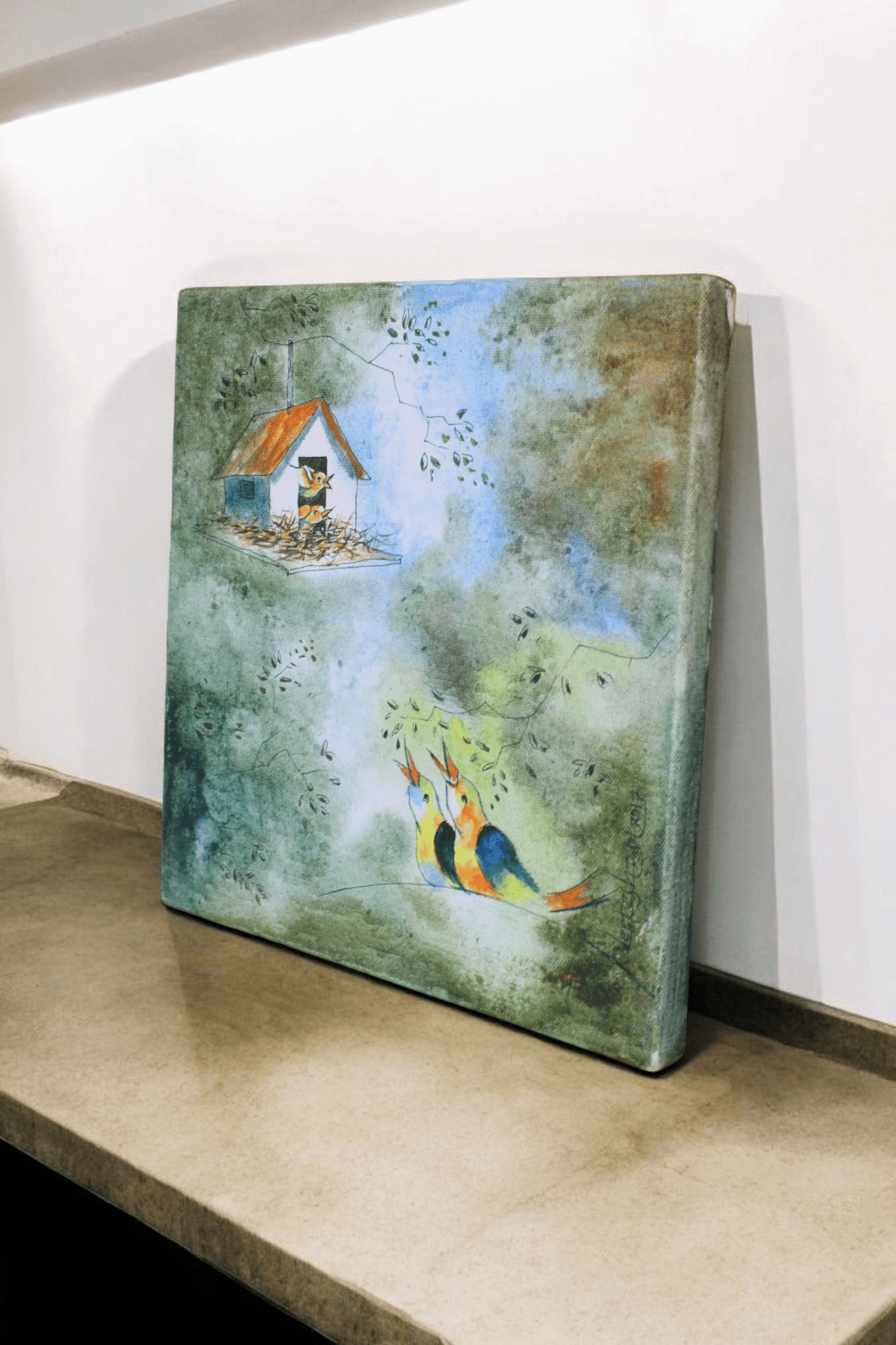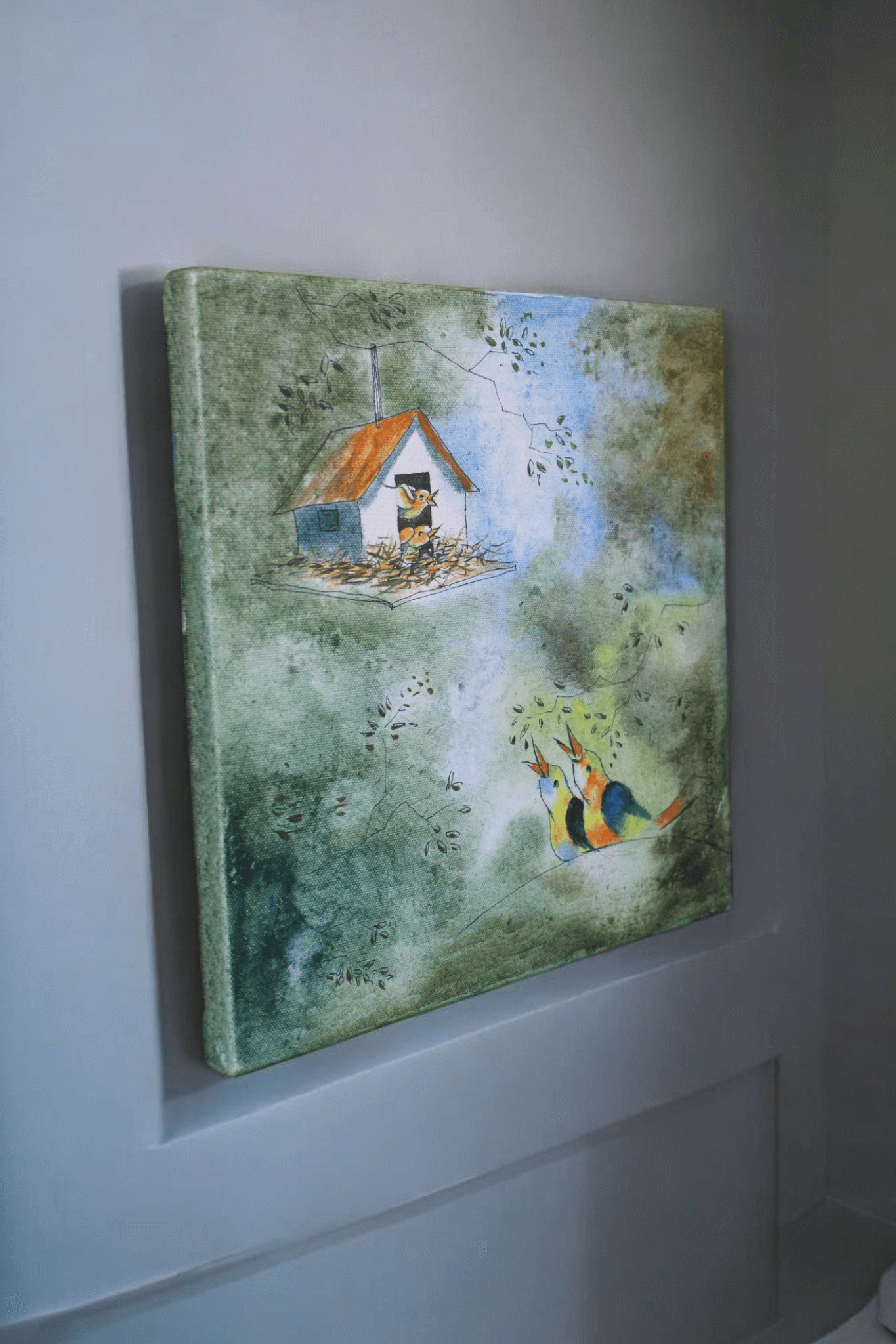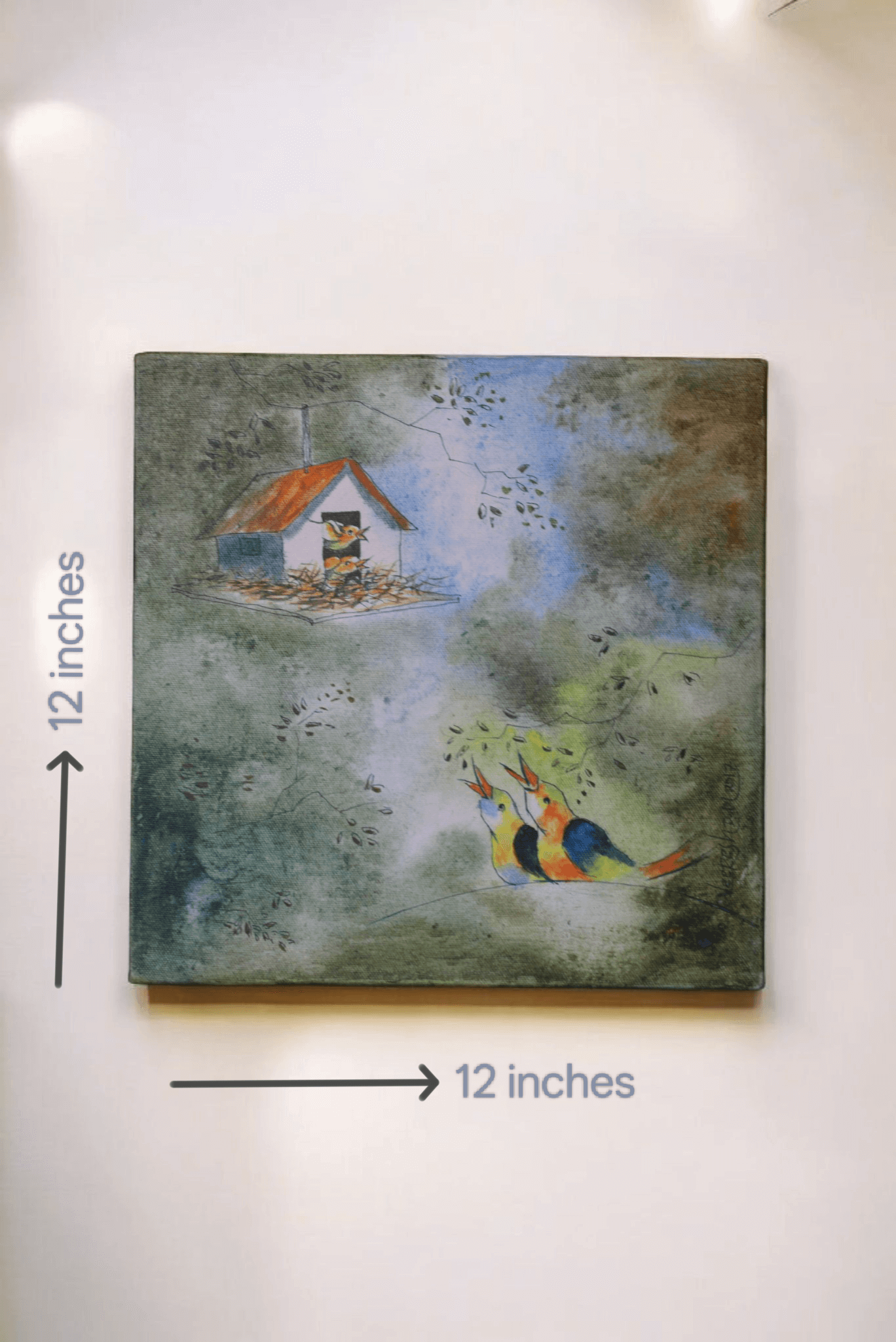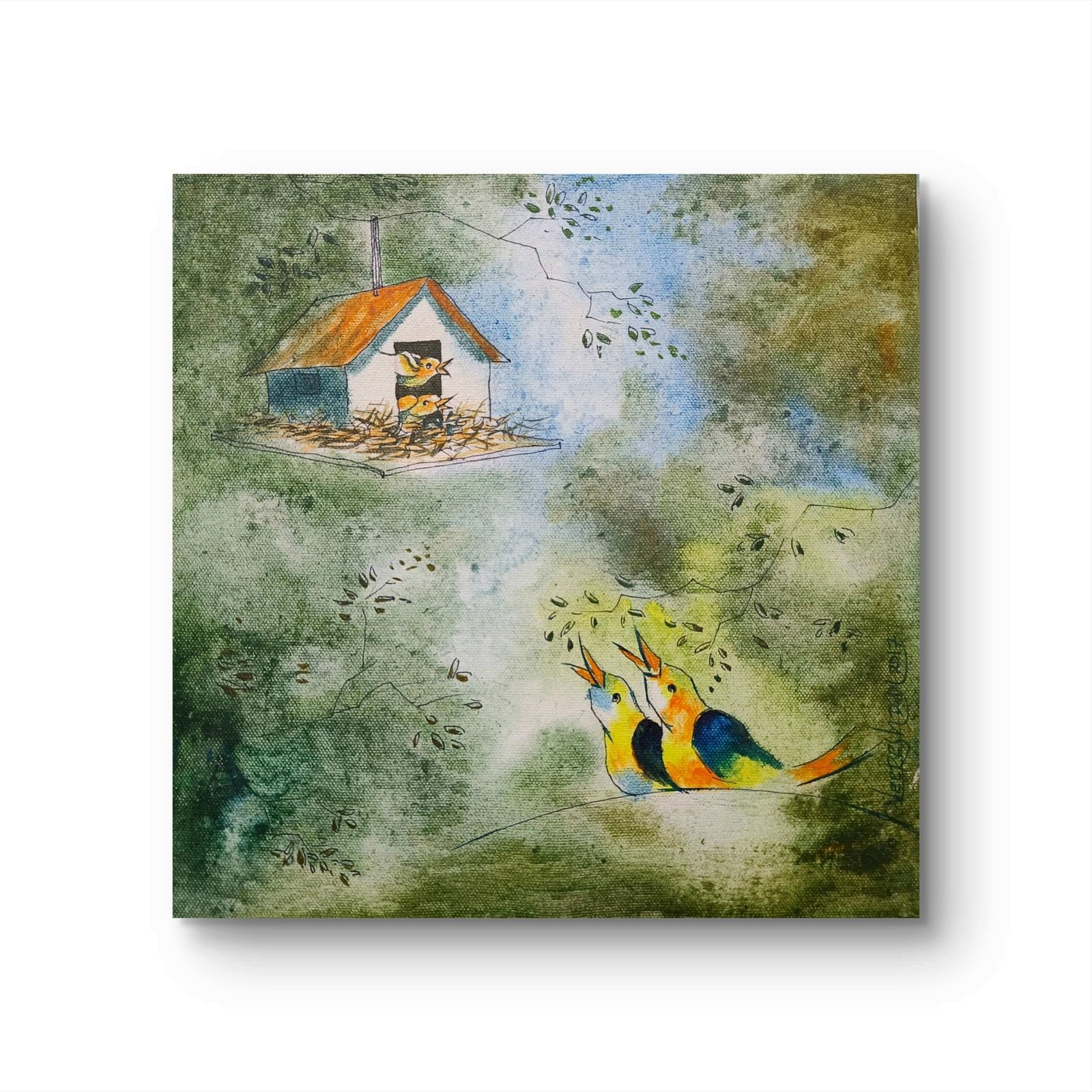 This artwork reflects companionship, connection, and a sense of home in nature. A sparrow sits safely in its birdhouse, while three other birds sing from below, symbolizing friendship, longing, and the bonds that unite all living beings. The soft hues and expressive brushstrokes evoke a peaceful, nostalgic feeling, reminding us that true warmth comes not from a place, but from the relationships we cherish
