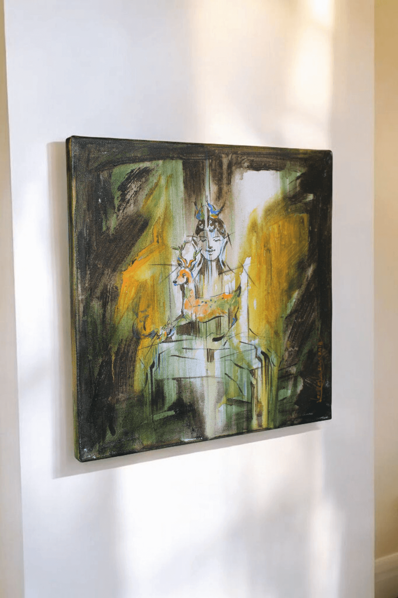 This artwork beautifully captures the sacred connection between a spiritual being and nature. The Harini (deer), a symbol of grace and intuition, rests gently in the hands of an enlightened figure, representing protection, compassion, and harmony with all living beings. The figure?s calm and composed presence signifies wisdom, serenity, and a deep bond with nature, embodying the balance between humanity and the natural world. The earthy tones and expressive brushstrokes create a mystical atmosphere, drawing the viewer into a moment of quiet contemplation. This painting is a reminder of the delicate balance between strength and gentleness, guidance and trust, and the coexistence of man and nature