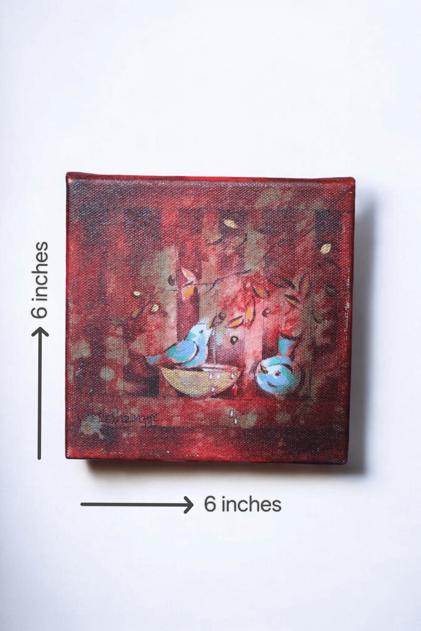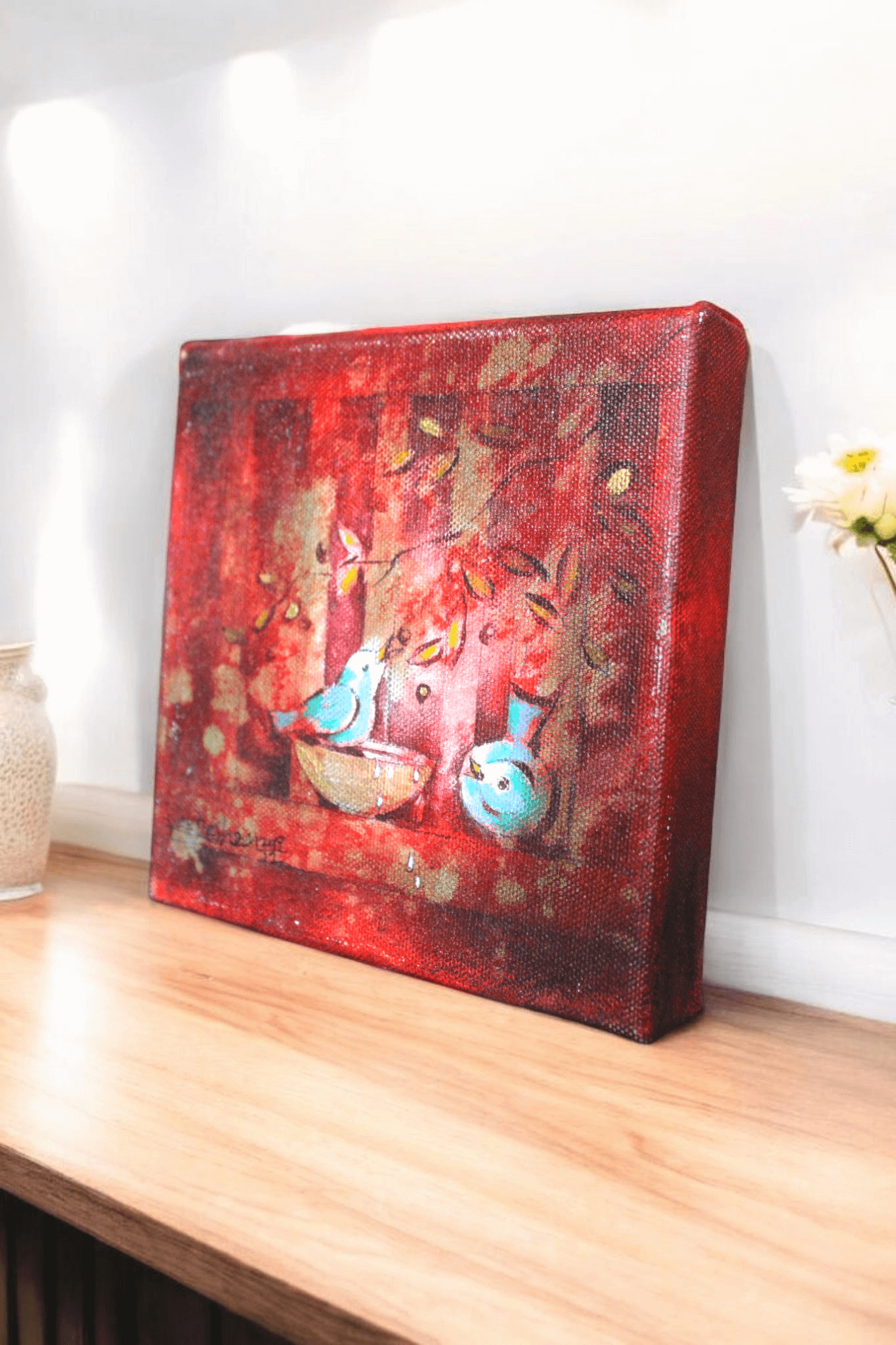 Infused with warmth and nostalgia, this exquisite artwork captures the essence of Indian courtyards at dusk. Two delicate birds perch by a traditional water bowl, their presence symbolizing peace, companionship, and the beauty of everyday moments. The deep red hues and earthy textures create a sense of richness, making this piece a perfect addition to any home or office space. The soft interplay of light and shadow brings the scene to life, evoking a feeling of serenity and harmony