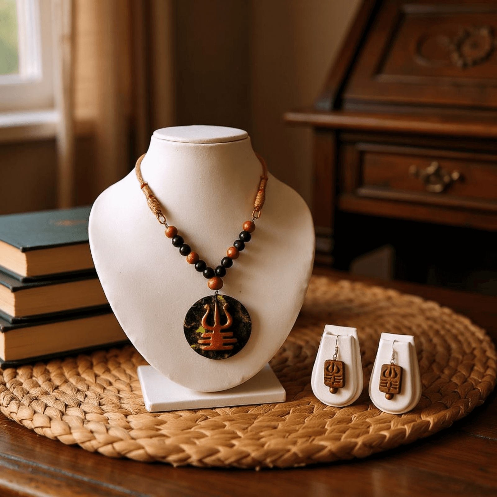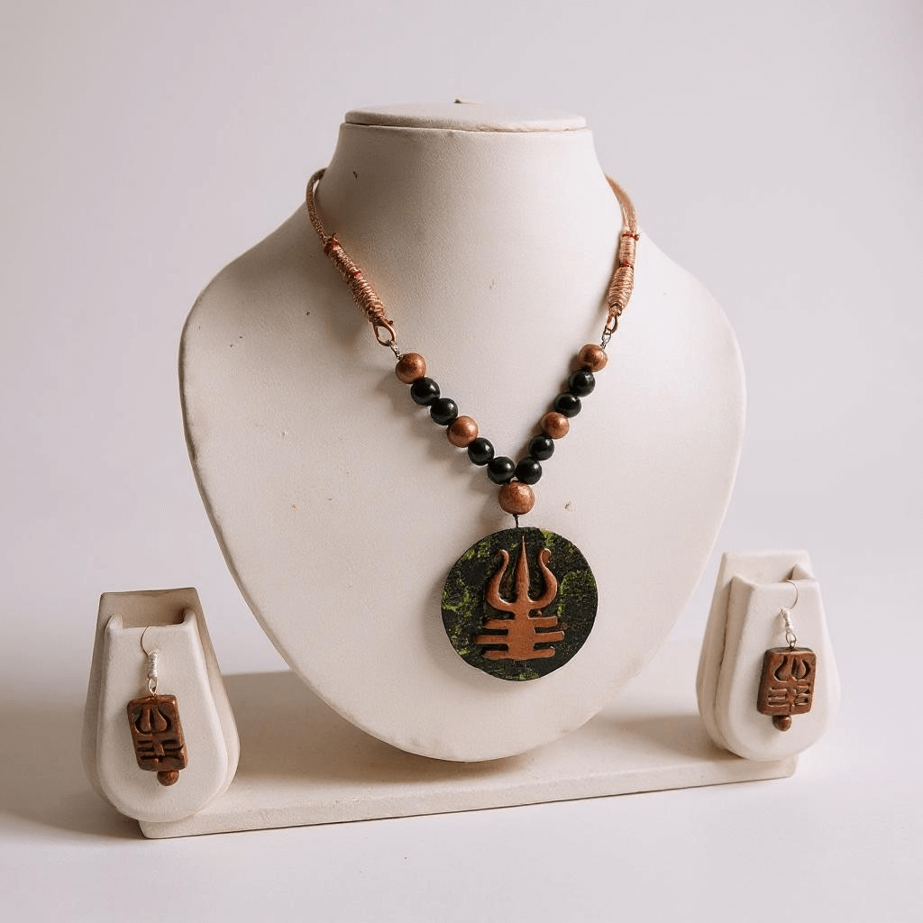 Elevate your ethnic look with this handcrafted terracotta jewellery set featuring a bold Trishul pendant. Lightweight, earthy, and designed to stand out.