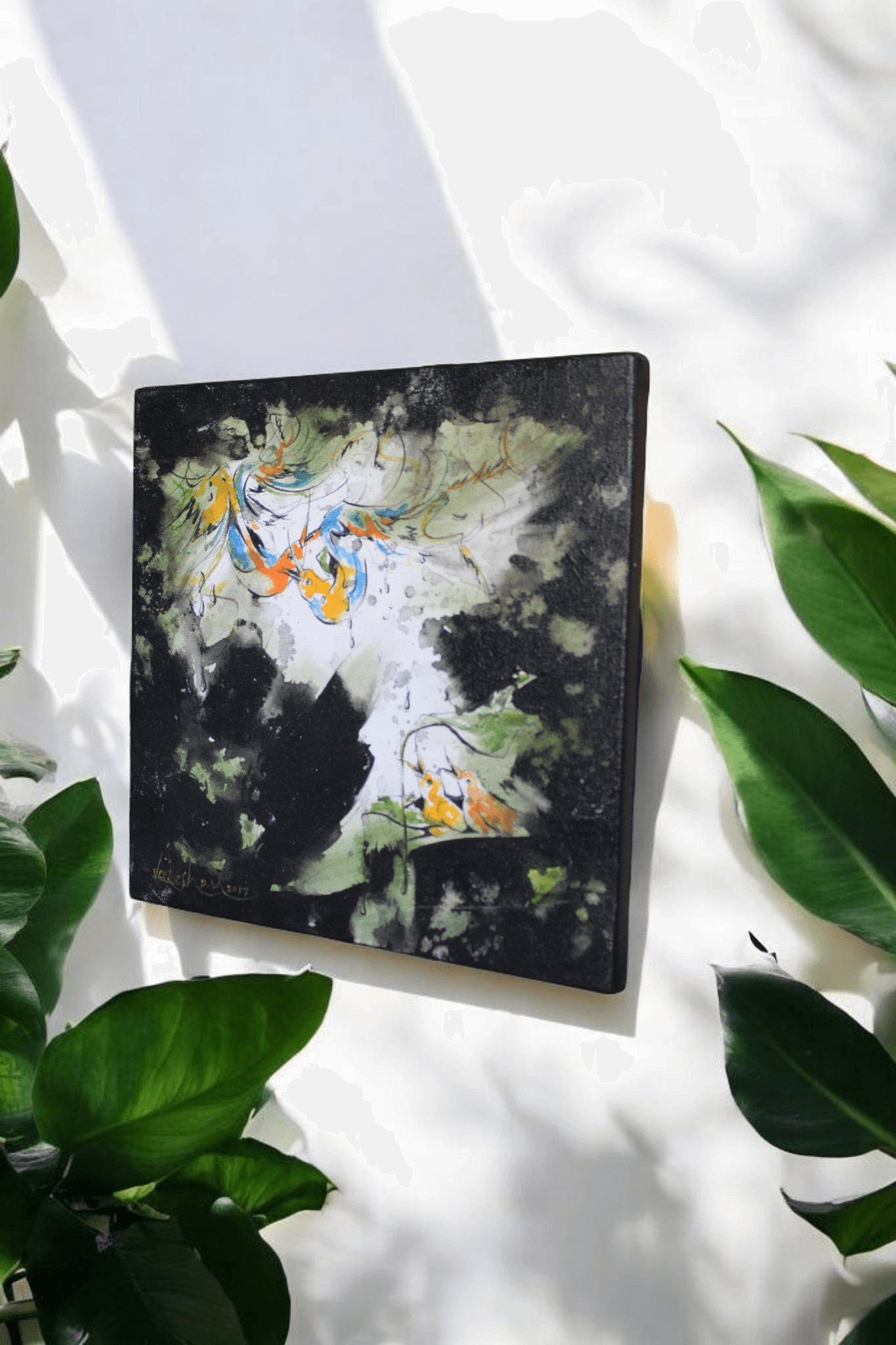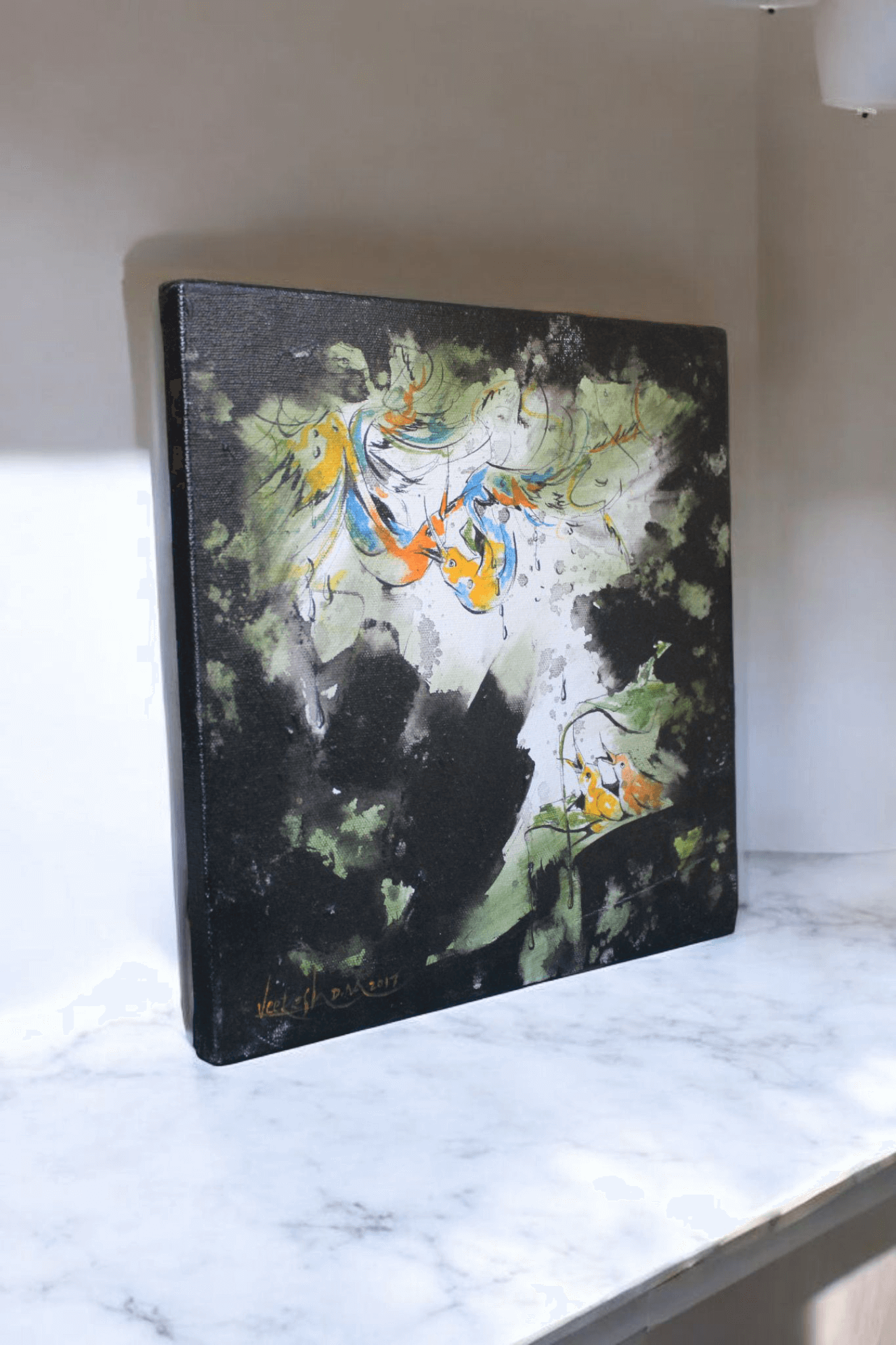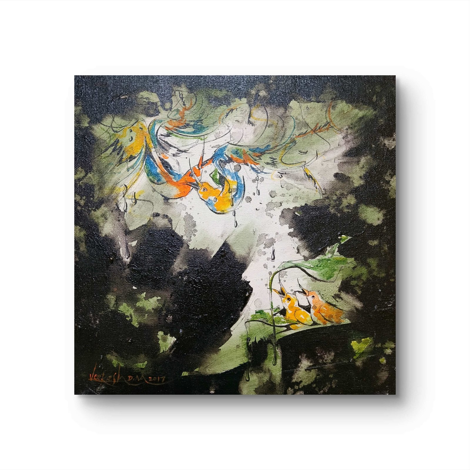 Varsha Gagana beautifully captures the essence of a monsoon-kissed forest, where nature thrives under the gentle embrace of rain. The golden-hued birds, adorned in strokes of saffron and blue, find shelter beneath lush green foliage, their delicate forms blending seamlessly with the rhythm of the downpour. The interplay of deep blacks and misty whites creates a mesmerizing contrast, evoking the serenity and mystery of a rain-soaked landscape. This artwork reflects the harmony of life, where every droplet nurtures, every leaf whispers, and every stroke sings the melody of the monsoon sky